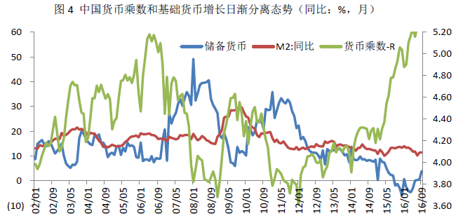 当前中国货币乘数异常高位的状态,显然不可持续。在没有调整RRR的情况下,货币乘数提高是随金融创新而来的金融多元化发展结果,特别是资本市场直接融资的发展和货币市场的扩大,使得全社会的信用扩张能力比以往有了显著提高。但是,金融发展和金融深化带来的货币乘数的提高,是一个缓慢的长期演化过程,短期效应不会明显。货币乘数高位难延续的局面,显然增加了加快我国储备货币增长的压力。图4“中国货币乘数和基础货币增长日渐分离态势”清楚表明,要保持M2增速平稳,储备货币的增长需要显著提高。