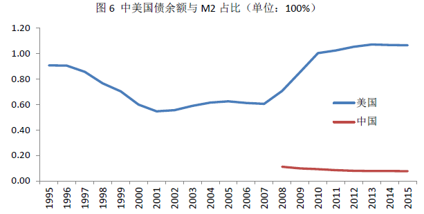 首先,创新思维加快国债规模增长。过去我们对国债规模增长的认识,都是基于债务可持续性和宏观调控的需要,并没有考虑主权货币增长的需要。因此,国债规模的管理和增长,需要将其放置在债务可持续、宏观调控和货币增长的“三位一体”框架下考量。由于没有考虑储备货币创造的需要,中国国债规模存量显然是不足的。本世纪初(2000-2003年),美国国债占流通货币(M2)的比重由前几年“新经济”开始之时的90%下降到了60%下方,美联储不断对财政结余政策表态反对,理由是国债规模下降影响到了联邦基金市场的运作。中美两国在国债对M2比例上的巨大差异,集中体现了中国缺少对国债的货币经济学意义认识,如图5“中美国债余额与M2占比”所示。2010年后美国国债占M2的比例持续位于100%上方,这一状况为美联储持续开展QE提供了条件;中国的国债规模占M2的比重持续位于10%下方,在储备货币创设来源转向OM和贷款、贴现窗口情况下,这一状况极大制约了我国基础货币的增长。