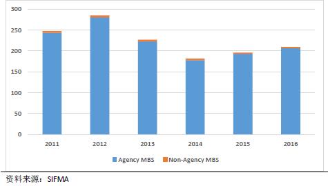 图8:2011-2016年MBS日匀交易规模(单位:10亿美元)