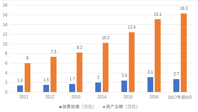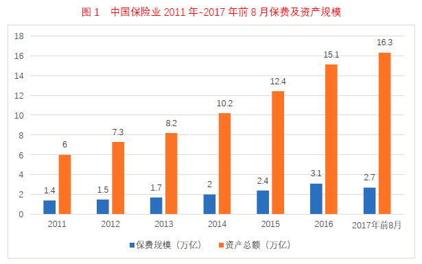 图1 中国保险业2011年-2017年前8月保费及资产规模
