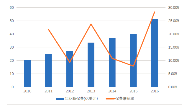 自2010年上市以来,友邦保险的保费规模增长迅速,其业务品质和产品结构都在持续不断的优化提升。虽然其在中国大陆地区的市场份额不高(仅1%),但大陆地区的业务规模已经超过了其他东南亚国家,位列第二。通过深耕中国市场,友邦保险2010年-2016年的年化新保费年复合增长率达到了16.7%,新业务价值(NBV)增长更是高达26.6%(见图6、图7)。