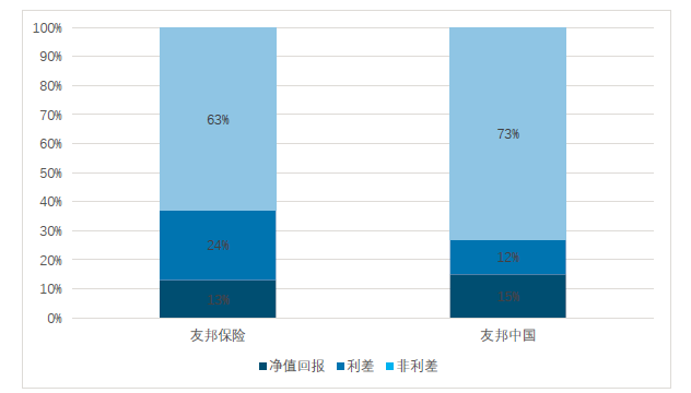 总体来说,友邦保险依靠其强大的渠道销售队伍主要在中国大陆销售高价值率的保障型产品。高素质的代理人队伍带来的是负债端稳定的现金流,同时这种类型的产品通常期限较长,成本也较低。此外保障型产品的占比与死差占比密切相关,因此友邦保险的价值结构和利润主要是以死差和费差为主,2016年友邦保险的利润结构中其非利差占63%,友邦中国的非利差占比达73%(见图9)。虽然其投资收益平均在4%-4.4%之间,仍保持了稳定的利差益。