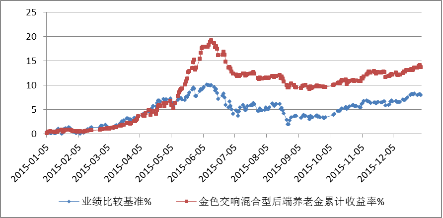 2015年负责管理的含权益的混合型后端养老金产品业绩优异,位列全行业同类产品排名前五分之一,年度收益率13.74%,并较多战胜业绩基准(如下图)。