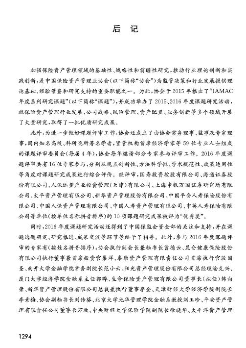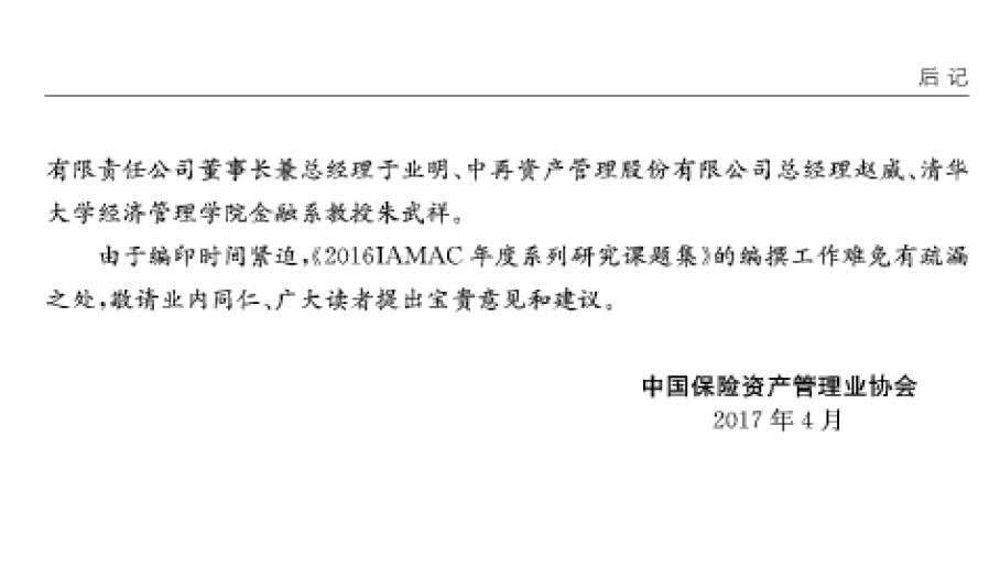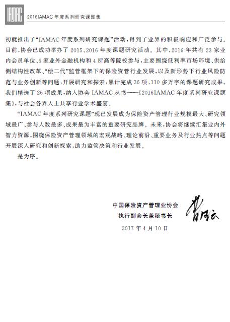 中国保险资产管理业协会(以下简称协会)组织编写的《2016IAMAC年度系列研究课题集》(以下简称2016年度《课题集》)已于2017年7月1日由上海财经大学出版社在全国范围公开出版发行。