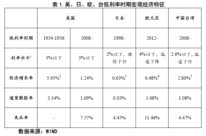 根据上文以及数据的可得性,我们以长期国债利率作为研究标的,通过考察美国、日本、欧元区、中国台湾四个经济体曾经或正在经历的低利率环境希冀发现低利率环境的主要经济特征,如下表所示: