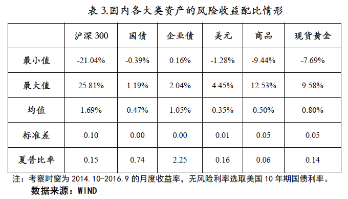 截至2016年9月底,国内股票、国债、信用债、外汇、黄金、大宗商品经过风险调整后的收益如下表所示:
