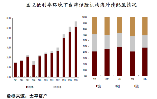 在低利率环境下日本、欧元区、中国台湾的保险机构利用境外利率水平高于境内利率的现实条件增加海外资产配置的比重,提升投资组合整体的收益率。以台湾为例,其保险机构持有的海外债券和海外股票的规模都呈现出逐年上升的趋势,且以海外债券投资为主。考察其海外债券投资的明细结构,以北美债券为主,占到海外债券投资的一半以上。总体而言,其海外投资风格较为稳健,且正确选择了宏观经济状况相对较好的发达经济体作为投资标的。
