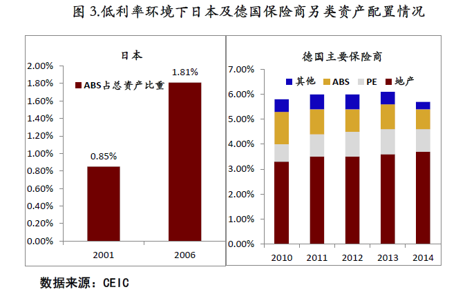 为提升投资组合的整体收益率,海外保险机构积极利用保险资金长久期特点,拉长配置期限,增加非标类资产的配置比重。以欧元区和日本为例:日本保险机构大幅增加了对于ABS和MBS的配置比重;而欧元区保险机构则增大了对于PE和不动产的配置比重。出现上述差异的主要原因在于日本和欧盟面临的金融环境具有差异:对于欧元区而言,欧债危机后信用风险飙升ABS信用资质下沉,加之监管收紧,其市场规模萎缩不适于配置型资金投资,因而欧元区保险机构转向了股权类非标资产和不动产;对于日本而言,为剥离银行坏账盘活房地产市场、促进居民部门加杠杆,日本央行对ABS及MBS的发展持鼓励态度,其市场规模迅速扩张,导致保险机构顺势增大了对其配置的力度。