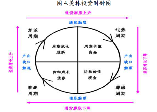 美林投资时钟理论根据宏观经济周期的不同确定了不同时期需要优先配置的大类资产类别。当前的低利率环境对应着通胀、经济增长双降的衰退周期,按照其理论应当优先配置债券等防御成长类的资产。