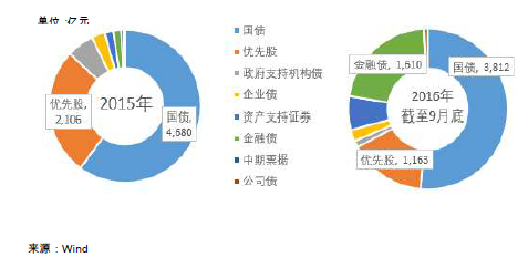 投资优先股,有利于缓解寿险行业长期存在的久期错配的问题。寿险行业整体“长钱短配”问题严重,寿险公司的负债久期较长,而与之匹配的长期资产供应不足。2015年全年,寿险公司的规模保费高达2.4万亿元,即使消除理财型保险影响之后,原保费收入依然高达约1.6万亿元。而2015年发行10年期以上的债券不到5700亿元,其中国债为4680亿元。当年优先股发行规模达到2106亿元,几乎为10年期以上国债的一半,如图表2所示。2016年截止三季度末,共发行10年期以上的债券及优先股约7400亿元,优先股发行规模仅次于国债、金融债,达到1163亿元。由此可见,优先股是除10年期以上债券之外,一种重要的长期投资工具,可以帮助寿险业应对长期资产供应不足的问题,从而缓解久期错配。