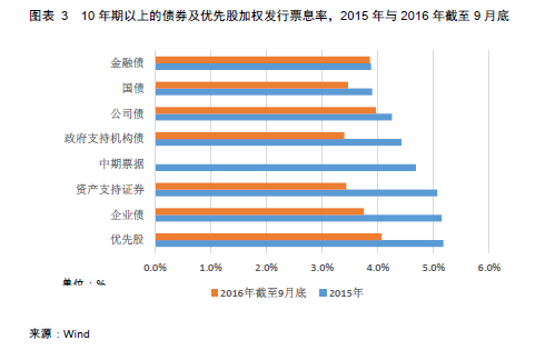 投资优先股,有利于保险资金提升投资收益率水平。如图表3所示,将2015年和2016年截止9月底发行的10年期以上债券及优先股按发行规模加权,计算可得:优先股的加权股息率分别为5.18%和4.07%,高于10年期以上任一债券品种的票息率。根据《指导意见》第十六条的规定,企业投资优先股获得的股息、红利等投资收益,符合税法规定条件的,还可以作为企业所得税免税收入。这使得优先股的税后股息率,相对同样具有一定信用风险的企业债、公司债、中期票据和资产支持证券的税前票息率,具有显著的优势。