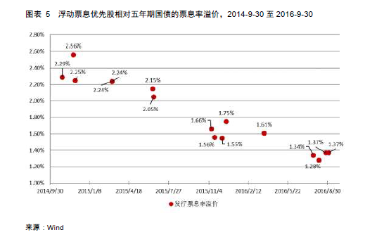 优先股发行股息率信用溢价的缩窄,也能从其与五年期国债收益率的比较中得出类似结论,如图表5所示。如前文所述,浮动股息的优先股股息率为基准利率(五年期国债收益率)加固定息差,基准利率每5年重置一次,固定息差保持不变。观察固定息差近年来的变化可以发现其一直在收窄,说明优先股相对较高的股息率备受市场青睐。但投资者也需要留一份清醒,判断其较高的股息率是否与其较高的风险性相匹配。