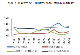 最后,优先股的股息率应高于发行企业的普通股股息率和债券收益率。相对普通股而言,优先股股东参与公司决策管理等权利受到限制,不能充分享受到股价向上的空间和流动性,会要求更高的股息率。另一方面,优先股股息相对债券票息的保障性更弱,也会要求更高的股息率。美国、英国市场的情况均印证了这一点,如图表6和图表7所示。