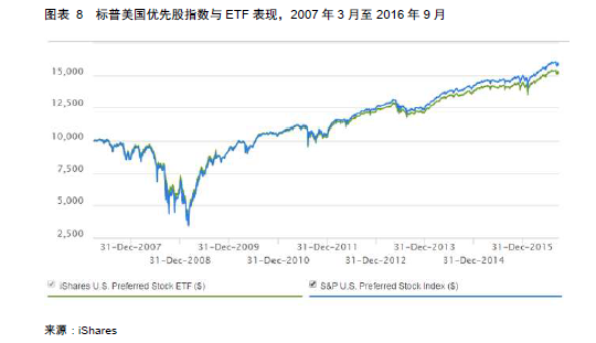 美国公开发行的优先股在满足一定条件后可以在交易所市场上市交易,机构投资者和优先股基金是主要的投资者。优先股ETF基金是投资者常用的优先股配置工具,同类型基金中,iShares U.S. Preferred Stock ETF(PFF)市场影响力较大,其他规模较大的ETF包括PowerShares的PGX和PGF。截止2016年9月30日,PFF基金资产净值约178亿美元。最近一年、三年、五年的年化收益率分别为8.44%,7.87%和8.34%,三年的波动率是3.81%,相对与标普500指数的beta值为0.27。近几年以来的收益率很高,波动率很低,与股票市场的相关性也低。如果将时间拉长一些,从图表8的净值表现可以看出,从2007年3月成立以来,该基金的年化收益率为4.47%,收益率接近债券,但风险远高于债券。它在2008年的金融危机时受到重创,跌幅一度超过50%,甚至超过了标普500股票指数。由此可见,美国优先股是否值得投资与其所处的市场大环境高度相关。当市场比较平稳时,优先股收益率远超债券;当市场如2008年发生危机时,优先股表现糟糕,甚至不如股票。