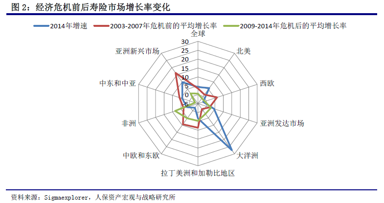 笔者认为,这主要有两方面原因:一方面,尽管低于金融危机前的水平,但中国寿险市场仍是全球增长最快的地区之一(图2)。业务规模是未来公司发展壮大和盈利增长的基础,相比之下发达国家保险市场的主要目标是管理做好存量的资产和负债管理。另一方面,行业资产负债管理能力和经验还不成熟。资产负债管理能力是以负债业务的多样性和投资渠道的多元化为基础的。伴随着2012年以来以“市场化改革”为核心的监管思路,中国寿险业真正意义上的资产负债管理开始起步,目前还处于经验积累的阶段。
