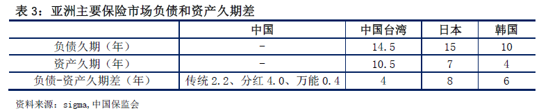 其中,中国保险业同样面临“资产荒”问题的困扰。但横向来看,由于长期费率管制、资本市场回报相对较高,中国保险业的利差损风险属于全球温和偏低水平。中国寿险产品在期限上的错配情况也属于亚洲较低水平(表3)。