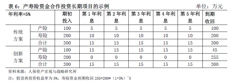 由于财险的资产比负债期限长、而寿险则相反,因此,可以通过集团框架下的“天然对冲”减少各自利率风险的暴露。假设产、寿险资金分别出资100万元和200万元共同投资于一个5年期、年化收益率5%的基础设施债权计划(表6)。其中约定,产险资金获得每期全部利息收入,寿险资金则在到期后获得本息收入。这种结构化设计将缓解产险资金参与长期投资的流动性压力,也使得寿险资金避免了再投资风险。