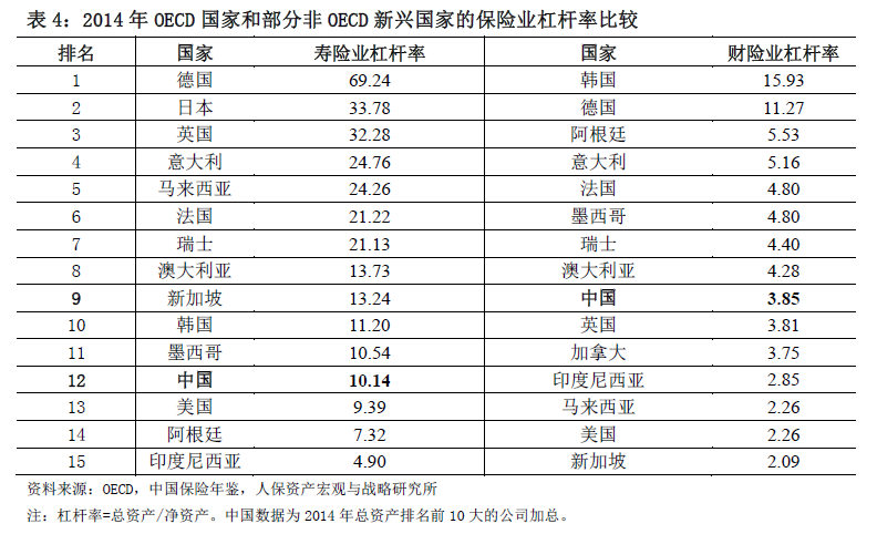 第四、提升资本利用效率。我们认为,相比其他金融行业,保险公司杠杆化操作多数为表内业务,受到监管部门的正常监管,杠杆风险能够得到很好的控制管理;而且与OECD发达国家相比,中国保险市场的杠杆比率属于中等偏下(表4)。