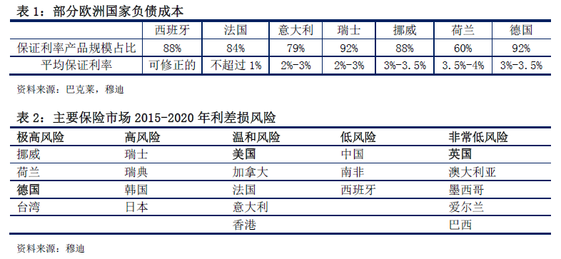 如果把目光聚集在保险资金,我们也可以看到全球范围内的保险资金均面临着不同程度的利差损风险。挪威、荷兰、德国、台湾等地区较为严重,北美、法国、意大利等相对温和。南非、西班牙由于寿险产品设计灵活性较高,抵御了一部分长期利率风险;英国、澳大利亚等国市场由于利率敏感型产品占比较大或保证利率较低,利差损风险暂时不高(表1、表2)。