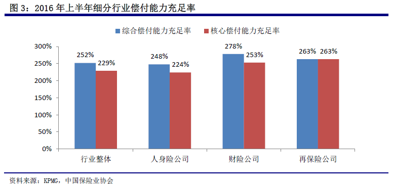 各国保险业杠杆率受到监管体制的影响较大,目前中国是通过风险导向的偿付能力体系来控制保险公司的杠杆风险。数据显示,2016年一季度,全行业综合偿付能力充足率为252%、核心偿付能力为229%(图3),远高于监管下限。较高的偿付能力充足率显示了行业的抗风险能力,也同时说明了行业的资本冗余较为严重。特别是对于一些大型公司,在偿二代体系下应提高资本利用效率。