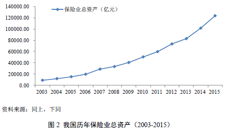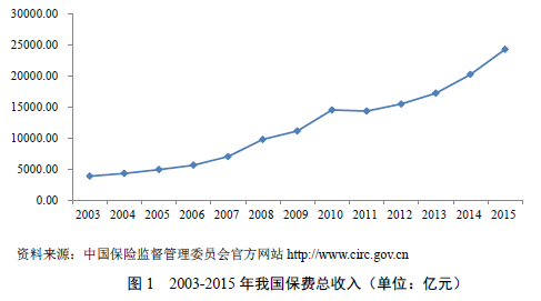随着我国保险业的迅速发展,尤其是寿险业在经历产品创新转型等深层次变革之后,保费收入不断增长,保险资金规模亦不断增加。加入WTO的五年期间(2001-2006),我国保险费总收入的年平均增长达到25.74%,2007年的保费达到了7035亿,同比增长了21.9%,2015年总保费为24282亿元,为2003年总保费收入的六倍多(参见图1)。