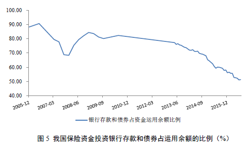 一直以来,银行存款是保险资金投资的主要渠道,一方面是资金安全性要求,另一方面也受限于国内资本市场的发展现状,加之相关法律法规滞后,使得银行存款等投资长期占据投资总份额的50%以上。随着法律法规的不断完善,监管能力的逐步提升,以及抗风险能力的逐步加强,银行存款与债券等固定收益类份额逐渐减少,两者的总份额占比从高达80%以上降低至50%左右(参见图5)。由于这类投资资产受利率影响较大,在低利率时期,保险资金在此类资产上获取的投资回报也较低,将会对保险公司偿付能力产生影响,尤其是对含有保证收益的传统类或分红类产品,这一冲击将更为显著,可能导致“利差损”,因此在低利率时期,应逐步减少固定收益类资产的投资份额,将更多可用资金投入其他领域,以获取最大化的投资收益。