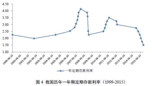 2008年9月爆发的金融危机被认为是“自上个世纪大萧条以来最严重的一次危机”,其根源可归为三个方面:1、金融市场的失灵和监管不足,金融市场失灵使得金融资源配置低效率,市场风险预警不足,监管乏力;2、过度宽松的货币政策。过度宽松的货币政策引发流动性过剩,各国政府为应对金融带来的不利影响,纷纷降息,全球进入降息周期,借以刺激投资,以拉动经济走向复苏。3、全球金融治理的缺失。目前,国际货币基金组织和世界银行等主要世界性全球治理机构在很多议题上常常陷入僵局,而世界贸易组织、巴塞尔协议III以及京都议定书等国际组织在治理形式上也变得过于松散化、多元化、碎片化,多边协定能力相对缺乏(Willem Molle,2014)。我国一年期存款利率在经历危机前高速增长以后,2008年下半年迅速回落,2011-2012年经历短暂反弹后,利率自2014年出现进一步的下降态势(参见图4)。