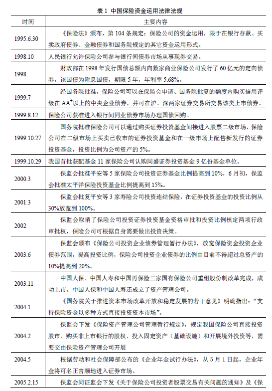 第三阶段,成熟发展。2005年2月,中国保监会联合中国银监会下发《保险公司股票资产托管指引(试行)》和《关于保险资金股票投资有关问题的通知》,明确了保险资金直接投资股票市场涉及的资产托管、投资比例、风险监控等有关问题。同时出台的《关于保险资金股票投资有关问题的通知》中,对保险机构投资者股票投资的总比例和单项比例等内容也作了明确规定。[1]《通知》要求,保险机构投资者股票投资应当依据《指引》,立足于长期、稳健投资,建立切实可行的风险控制制度,实施股票投资全过程风险控制。2009年10月,新《保险法》第一百零六条规定:“保险公司的资金运用必须稳健,遵循安全性原则。保险公司的资金运用限于下列形式:(1)银行存款;(2)买卖债券、股票、证券投资基金份额等有价证券;(3)投资不动产;(4)国务院规定的其他资金运用形式。”(参见表1)。