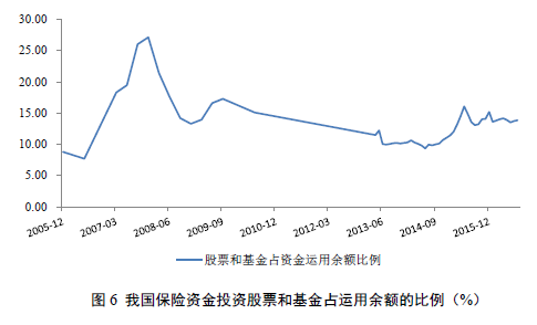 与固定收益类资产相反,权益类资产收益更多取决于市场行情,随市场而动,可以有效分享资本增长效果。根据投资学经典理论,股票价格与利率水平呈反比,低利率对资本市场来讲,无疑是一场发展机遇。因此,在低利率时期,增加权益类资产的有效配置显然更为迫切而必须。利用股权类资产投资“杠杆”的放大效应,不仅能有效提升保险资金的运用效率,还能增加投资收益,同时,保险资金具有长期性稳定性等特点,其进入资本市场无疑也会进一步带动资本市场发展,形成良性互动,实现“共赢”。近年来,我国保险资金投资股票和基金占保险资金运用余额比例呈现增长趋势(参见图6)。