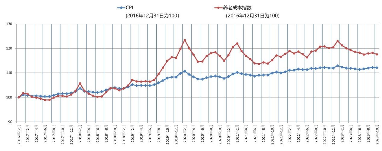 (图一):2016年底至2023年10月CPI及养老成本指数走势图
