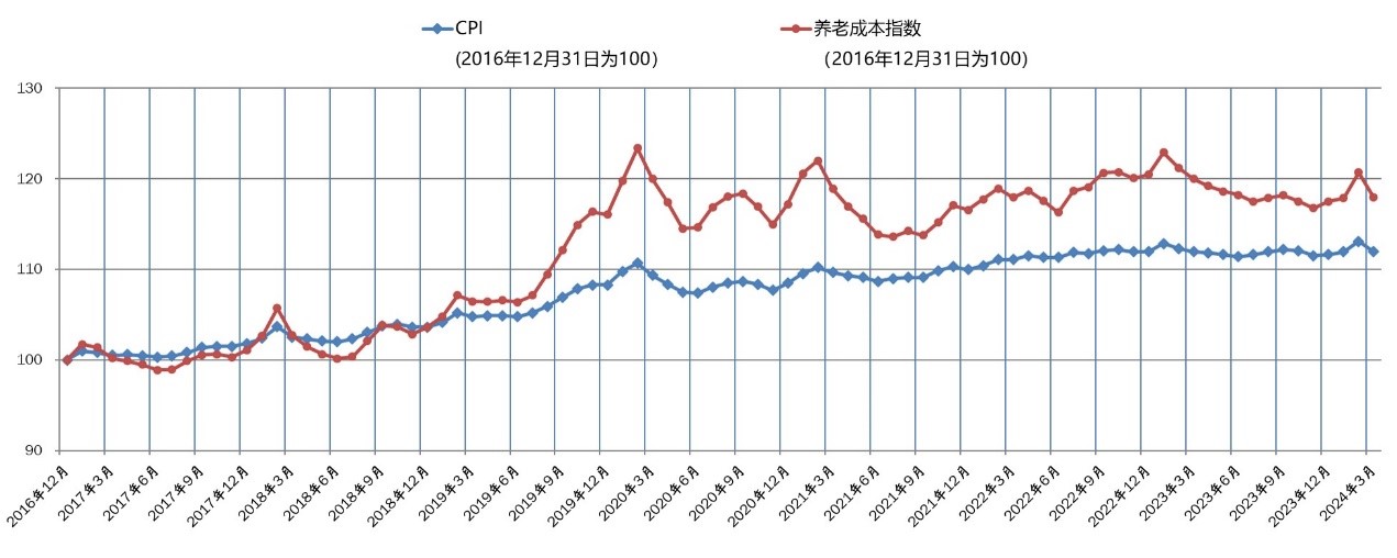 (图一):2016年底至2024年3月CPI及养老成本指数走势图