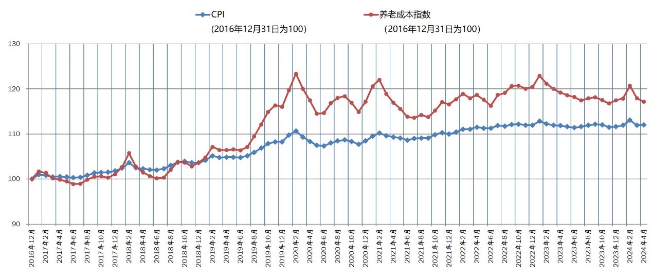 (图一):2016年底至2024年4月CPI及养老成本指数走势图