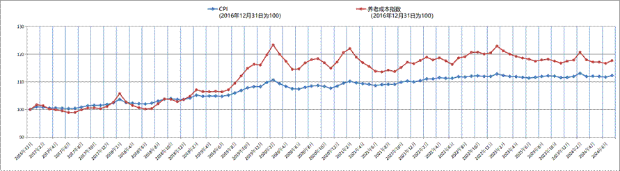 (图一):2016年底至2024年7月CPI及养老成本指数走势图