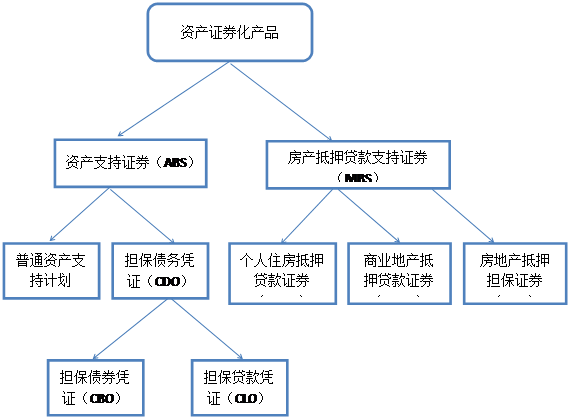 目前市场上的资产证券化产品一般可以分为两类:住房抵押贷款支持的证券化(Mortgage-Backed Securitization, MBS)和资产支持的证券化(Asset-Backed Securitization, ABS)。